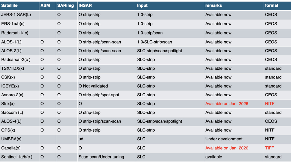 ALOS/ALOS2/JERS-1, ERS-1, TSX, TDX, CSK, Radarsat-1/2, Sentinel-1